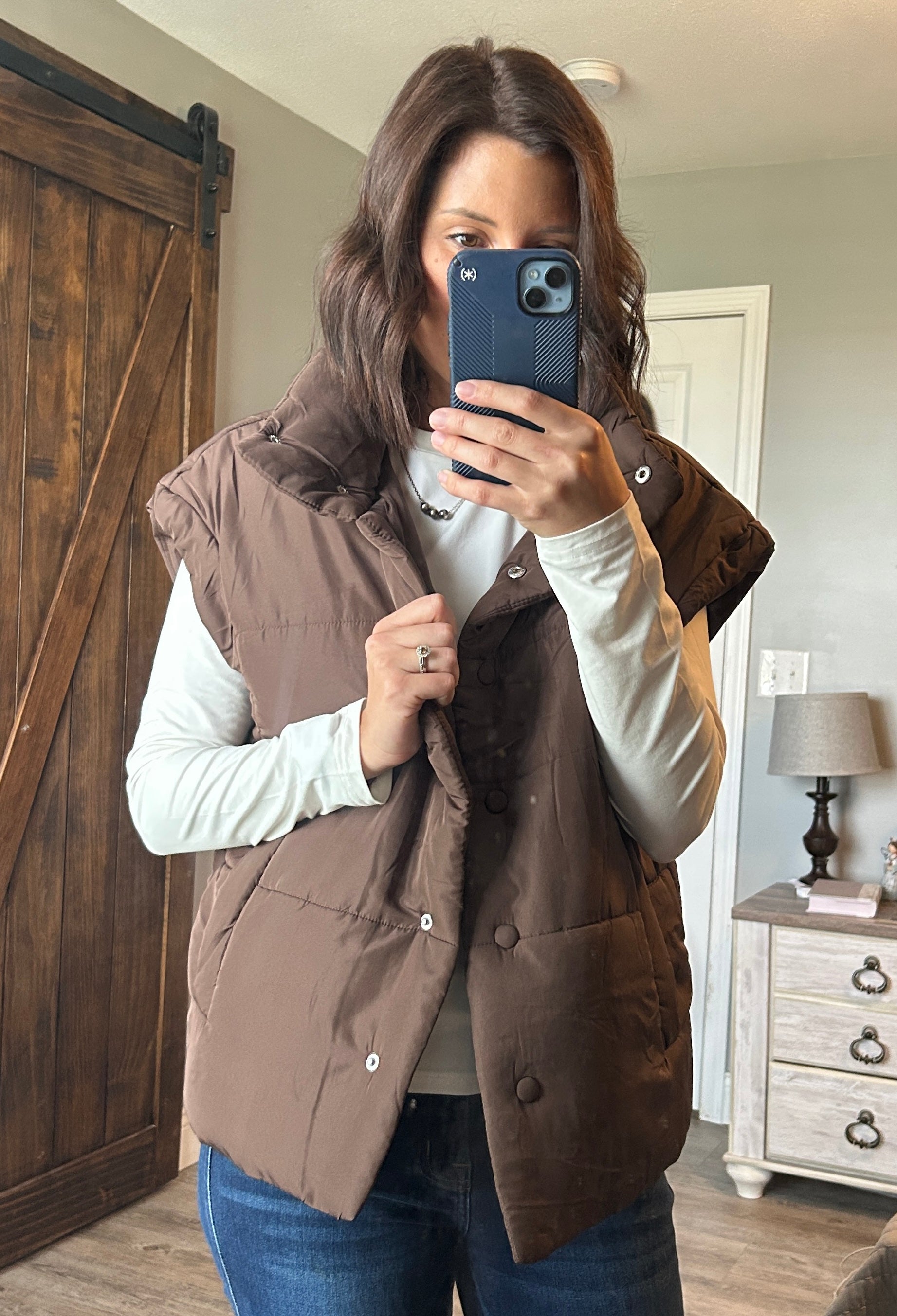 MOCK NECKLINE, SLEEVELESS, DROP SHOULDER, BUTTON DOWN, SNAP BUTTON, OVERSIZED FIT, PUFFER VEST